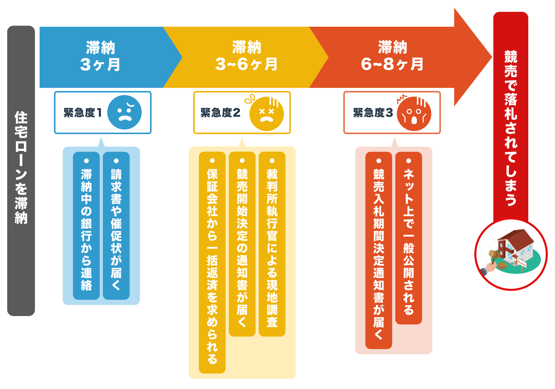 住宅ローンを滞納すると、ご相談者さまがローンを分割で返済する権利(期限の利益)が失われてしまい、金融機関は住宅ローンの一括返済を要求してきます。